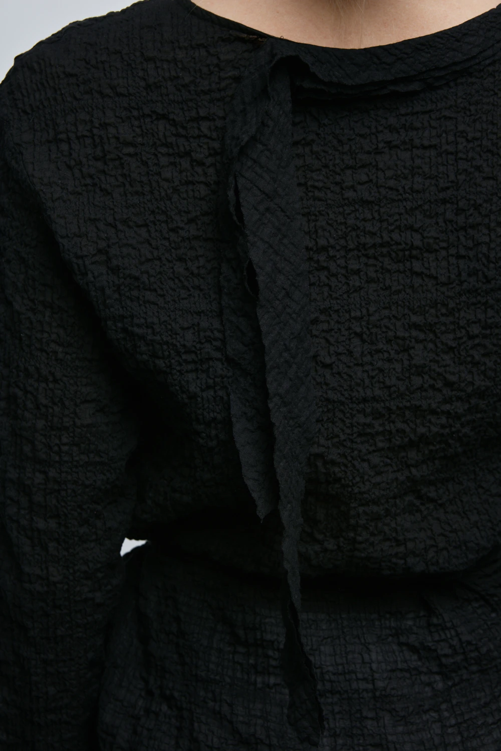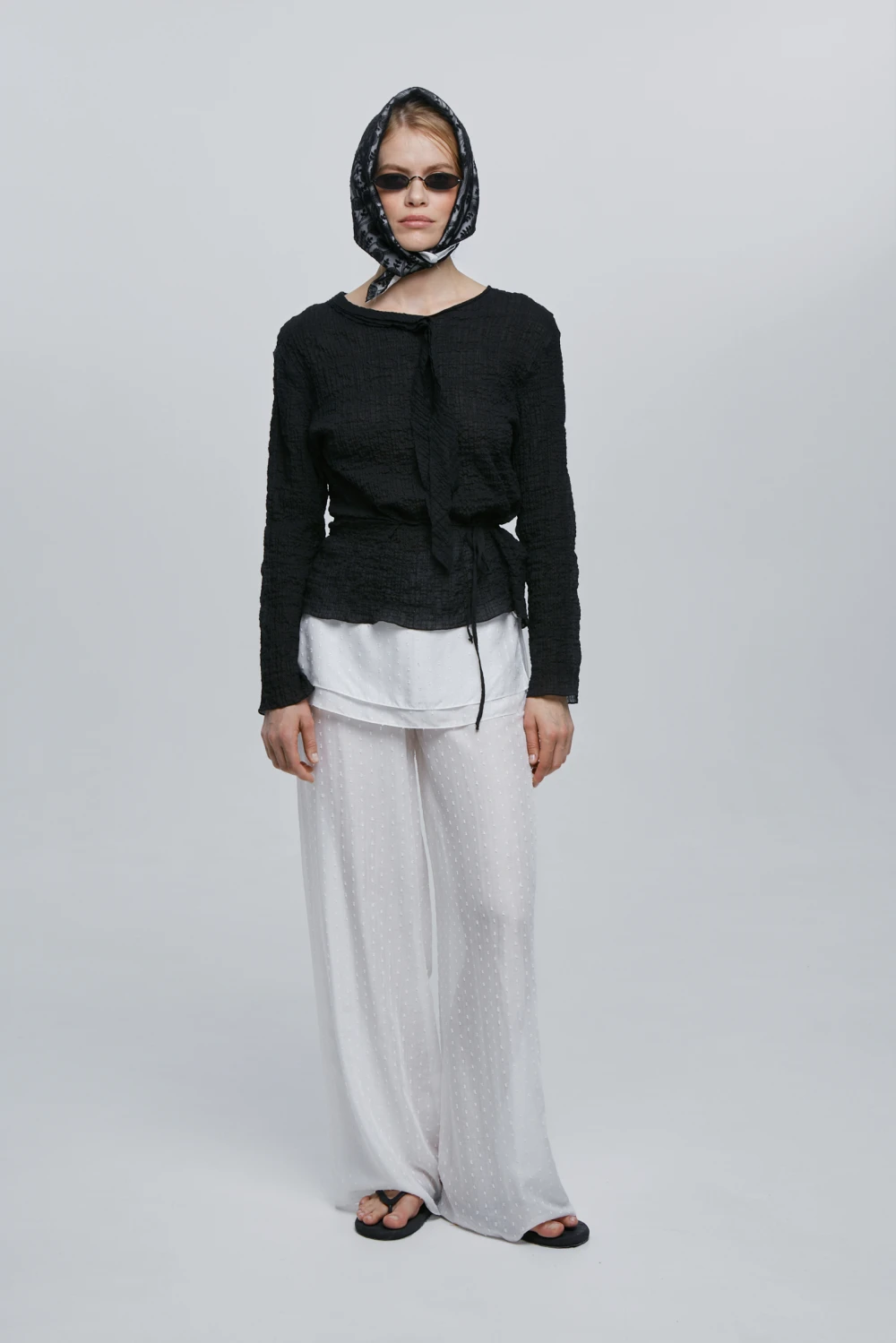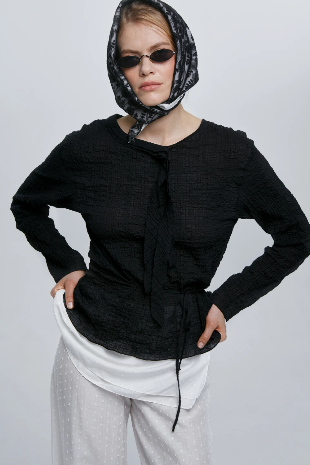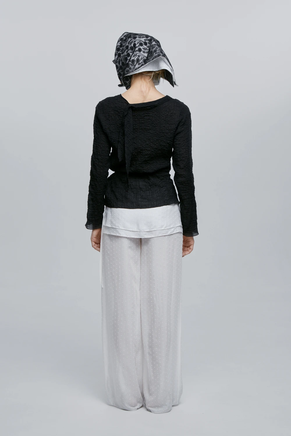 Полупрозрачный летящий лонгслив с асимметричными завязками - поясом и акцентным шарифком на шее спереди и сзади