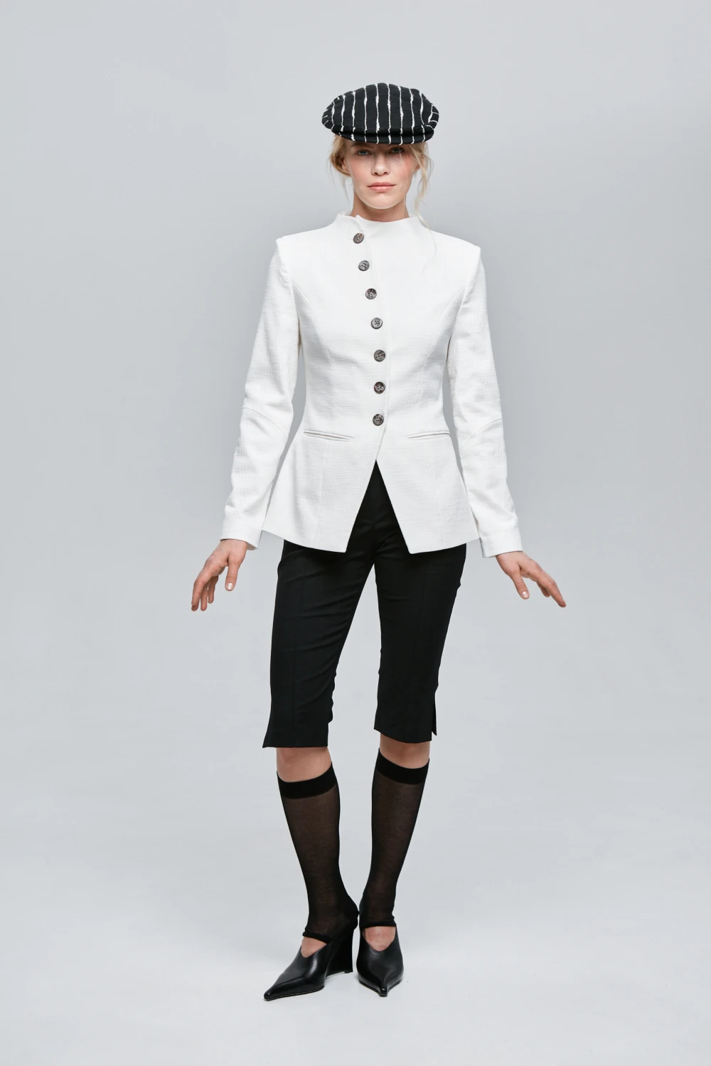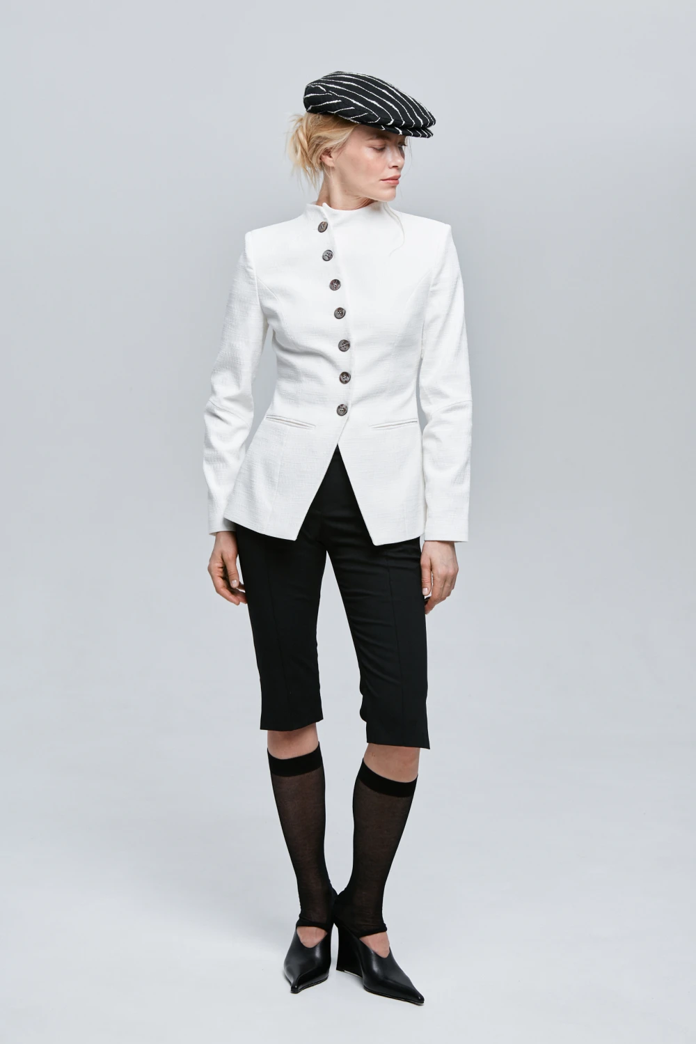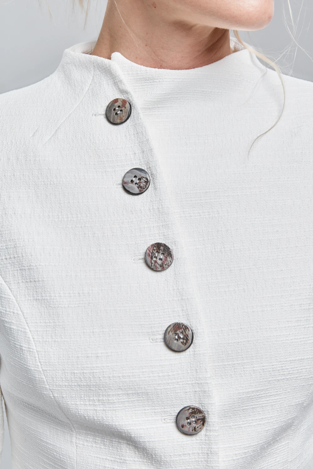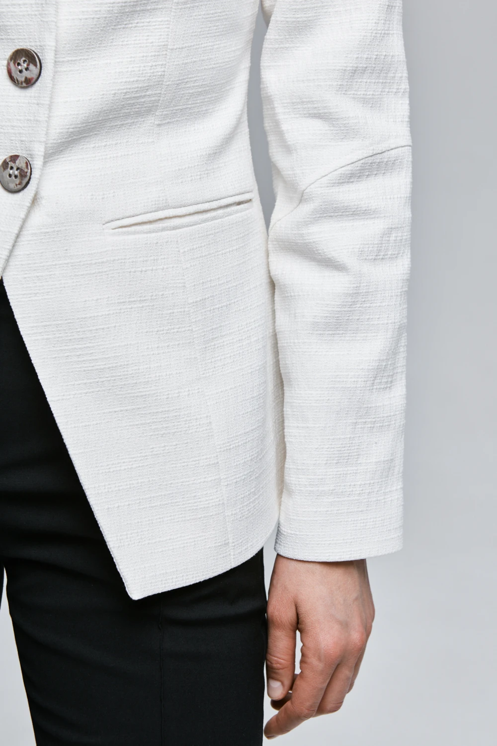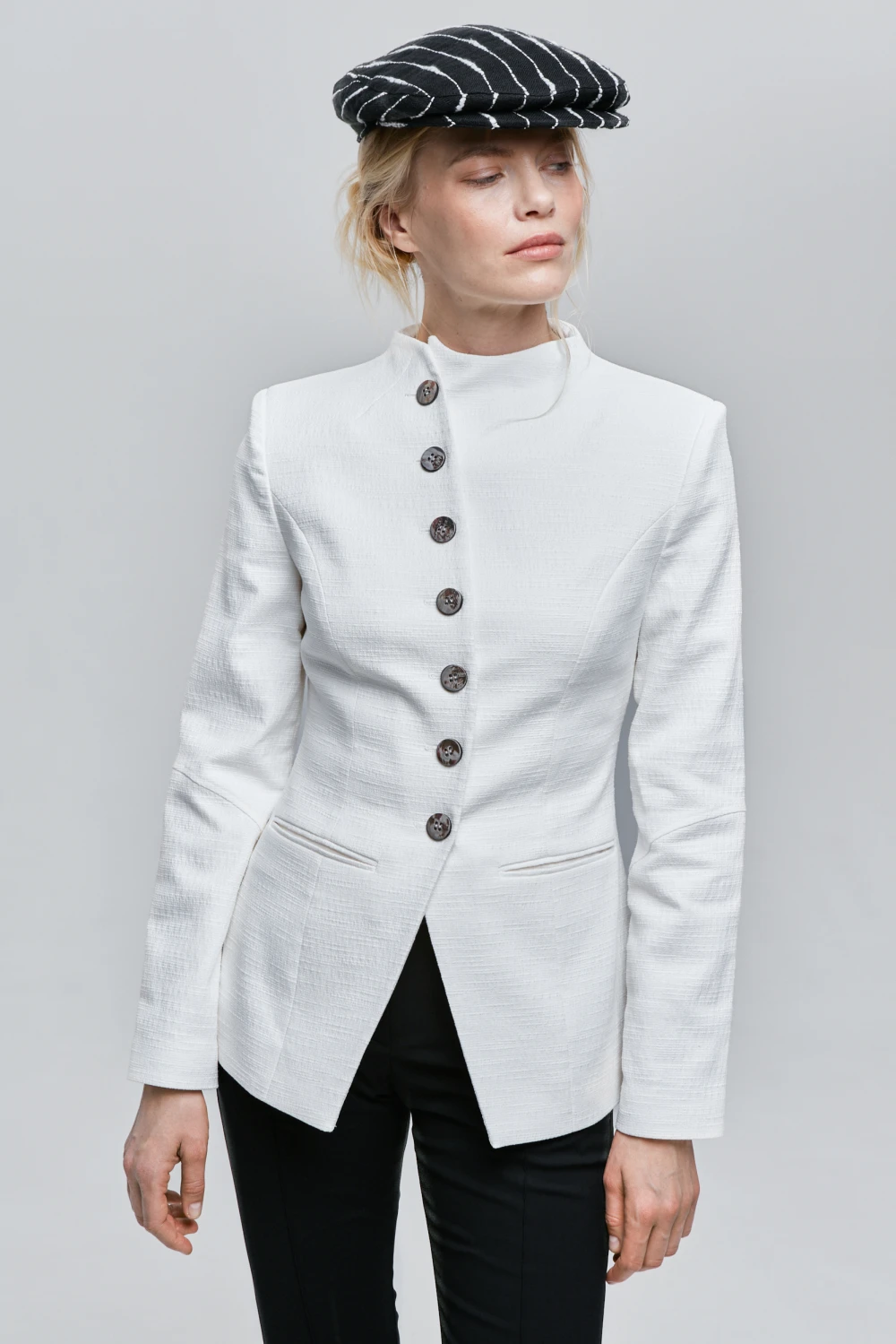 Приталенный тэйлоринг жакет с россыпью различных пуговиц.