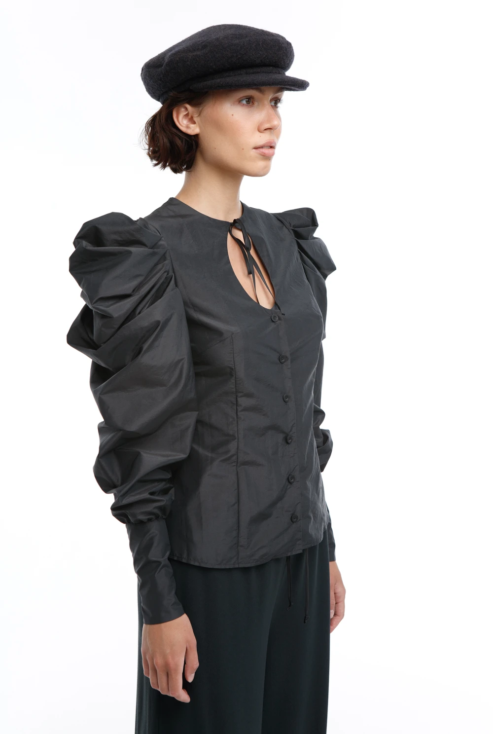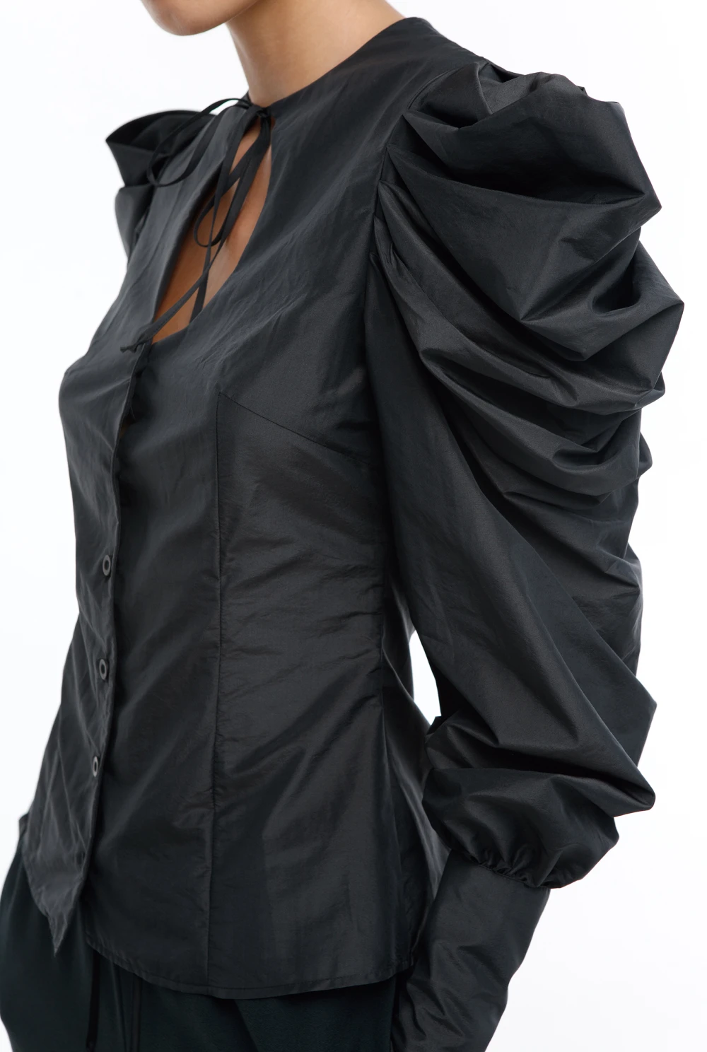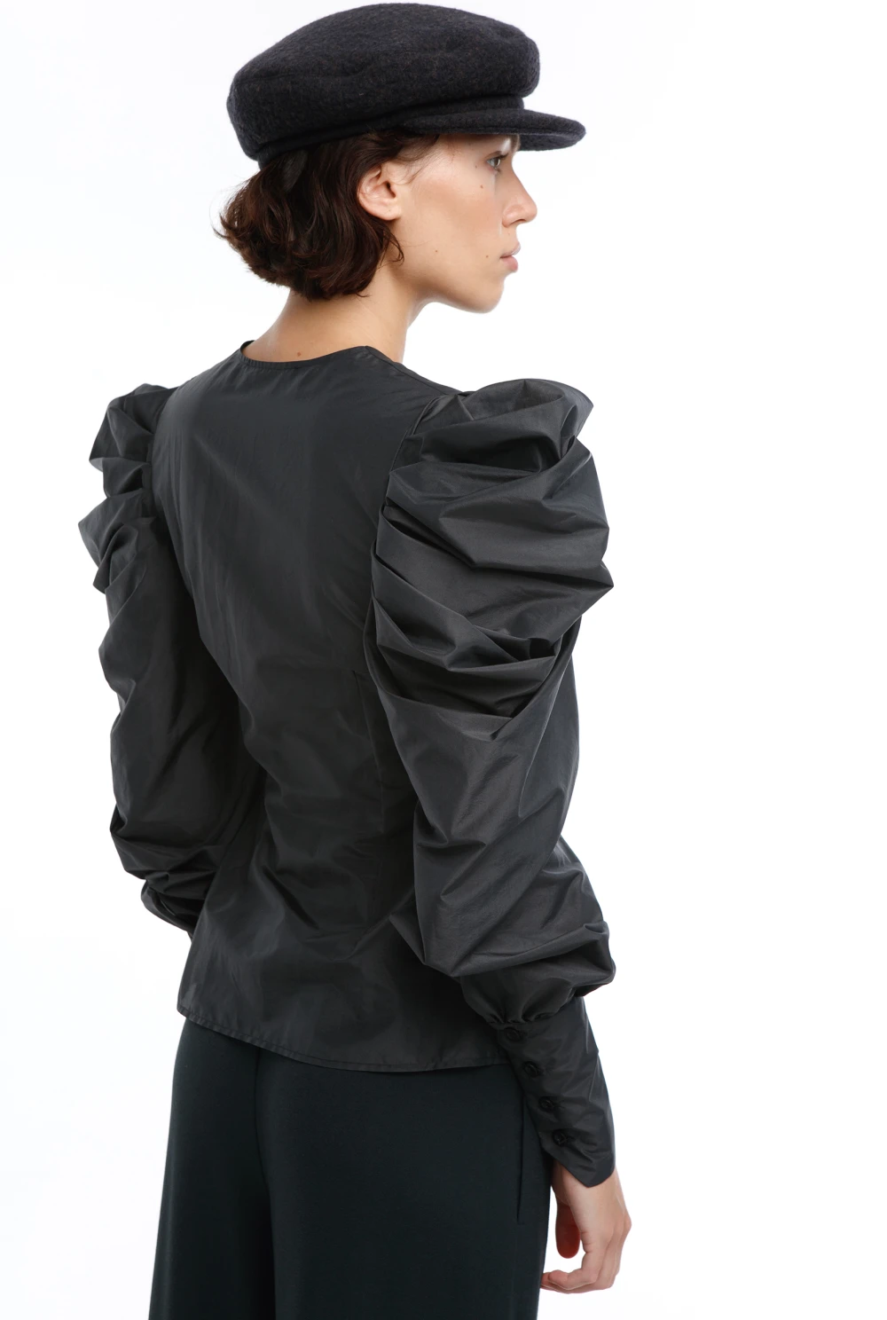 Приталенная блуза с объемными рукавами и завякой на воротнике
