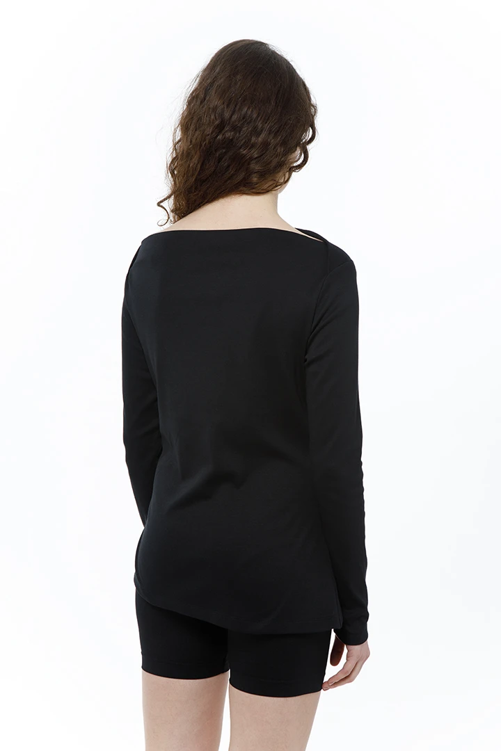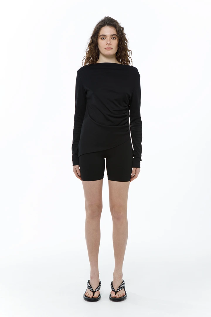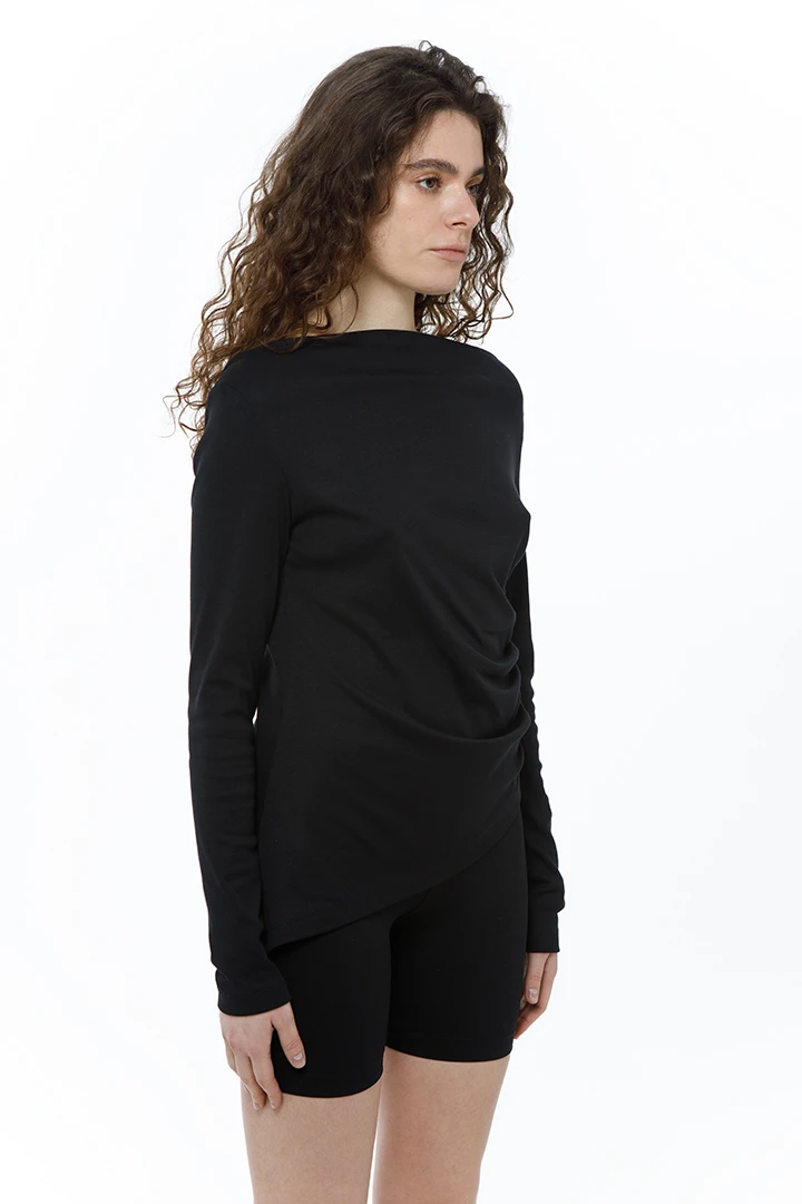 Облегающий лонгслив с открытми плечами и сборкой с левого бока изделия.