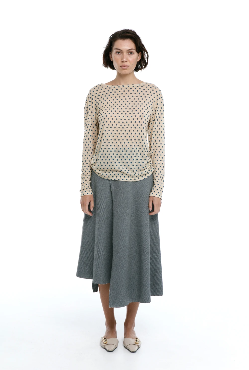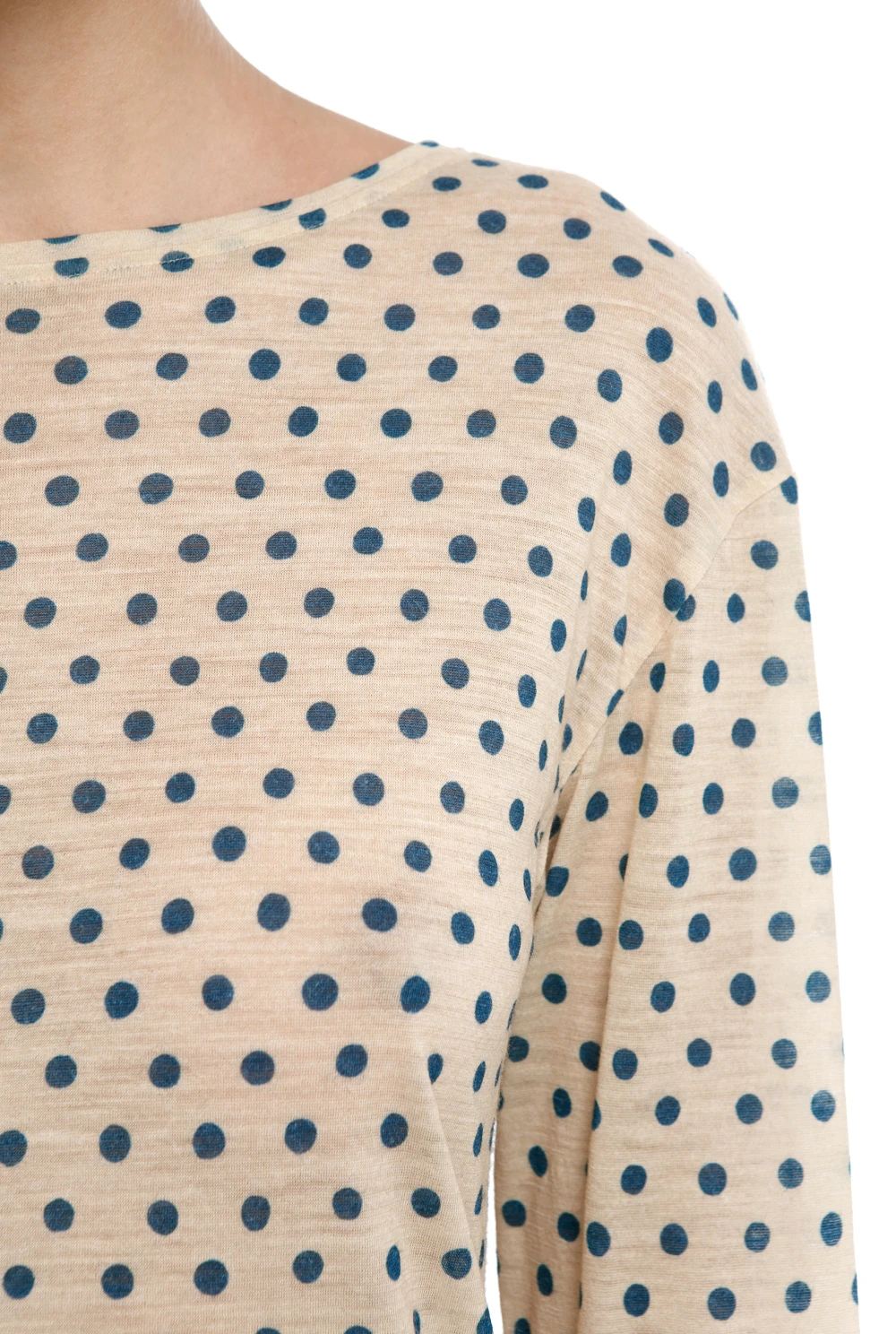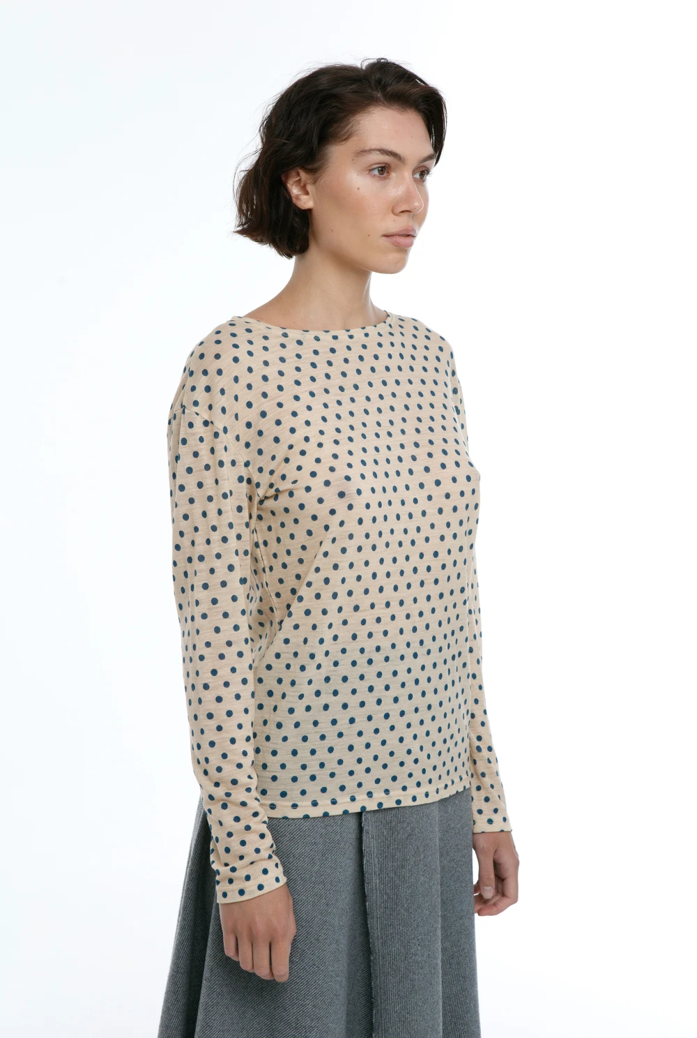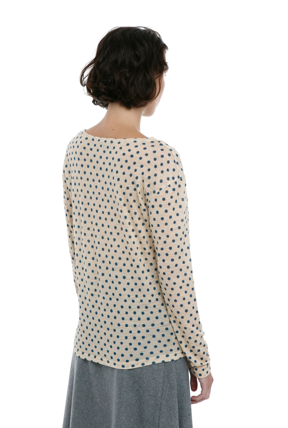 Лонгслив свободного кроя. Выполнен в двух цветах: коричневый и бежевый в синий горох