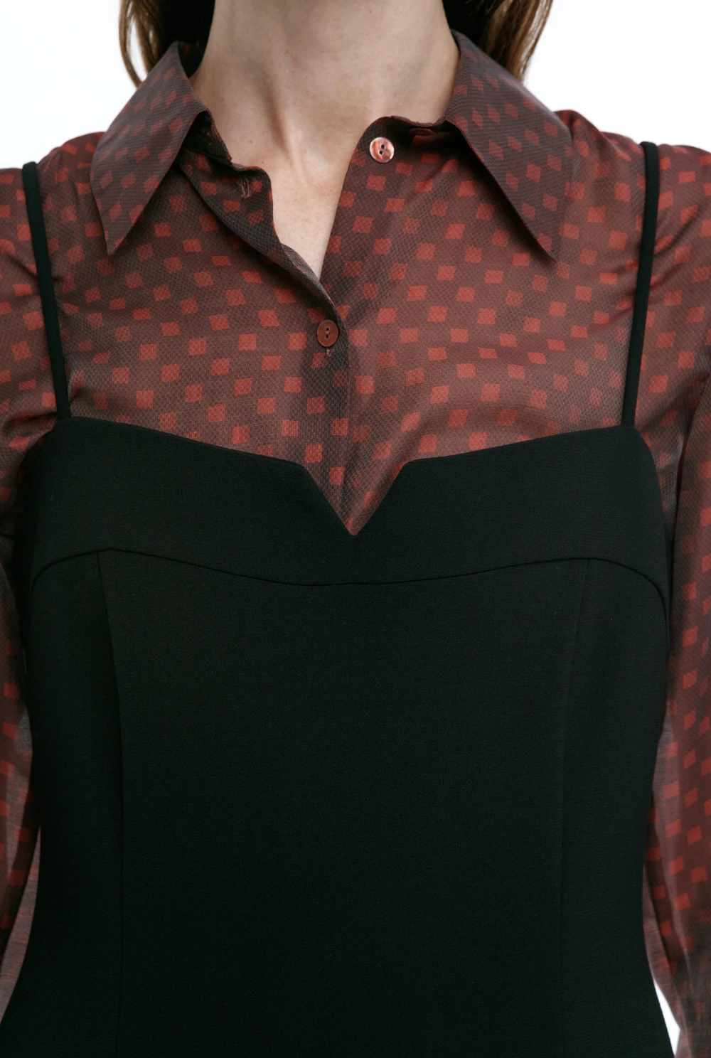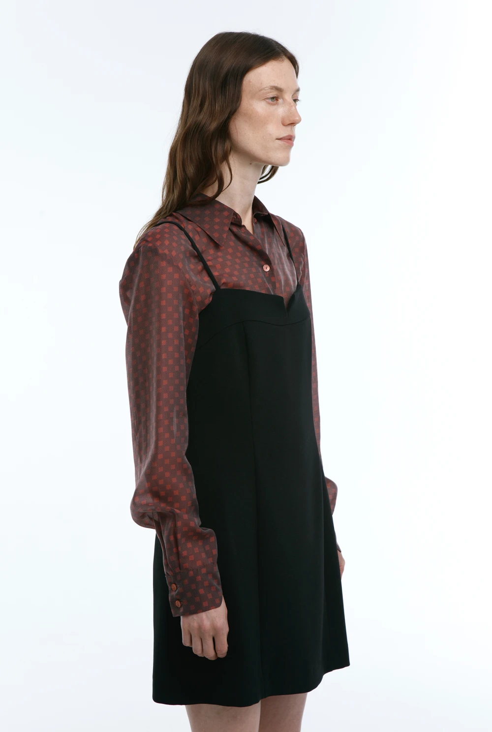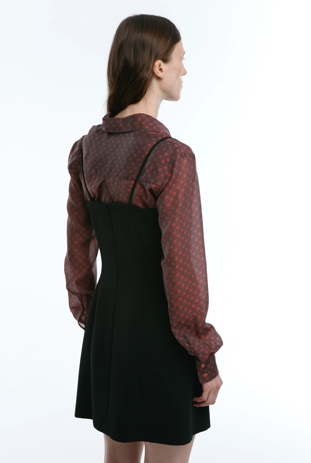 Платье-мини на тонких лямках. Выполнено в трех цветах: коричневый, черный, красный