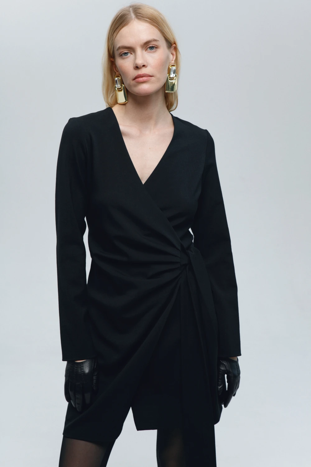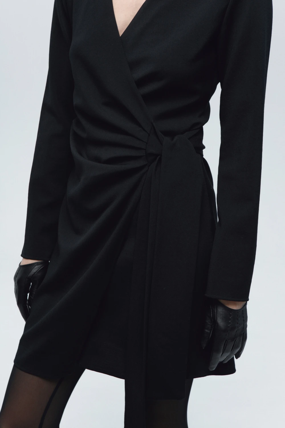 Платье на запах с длинным рукавом и длиной по колено.