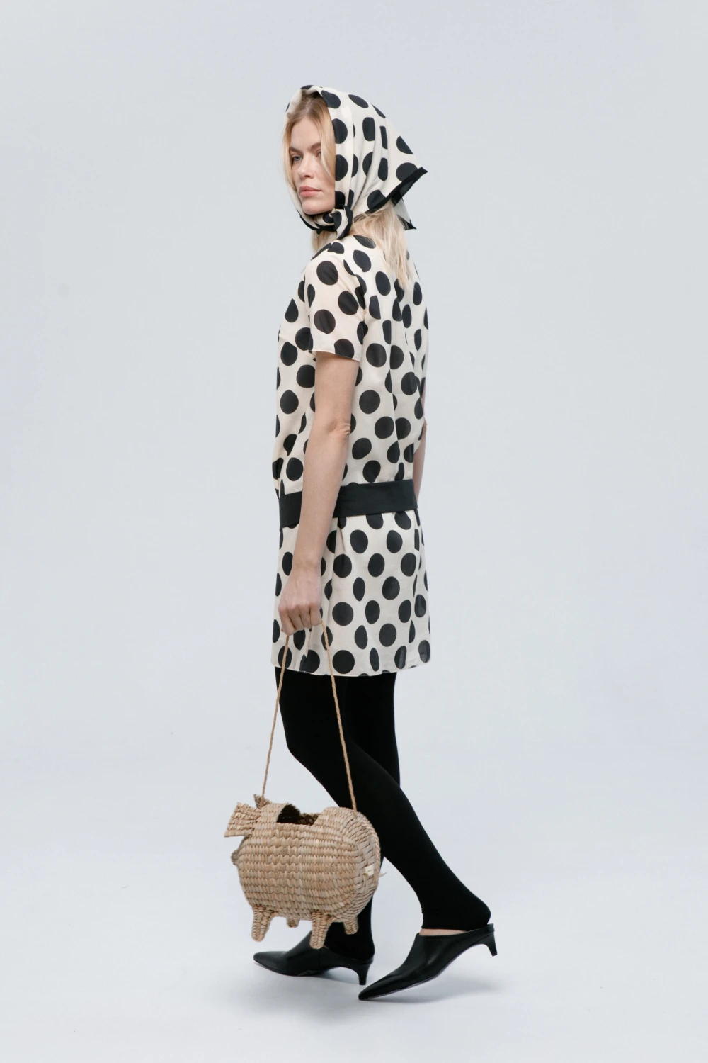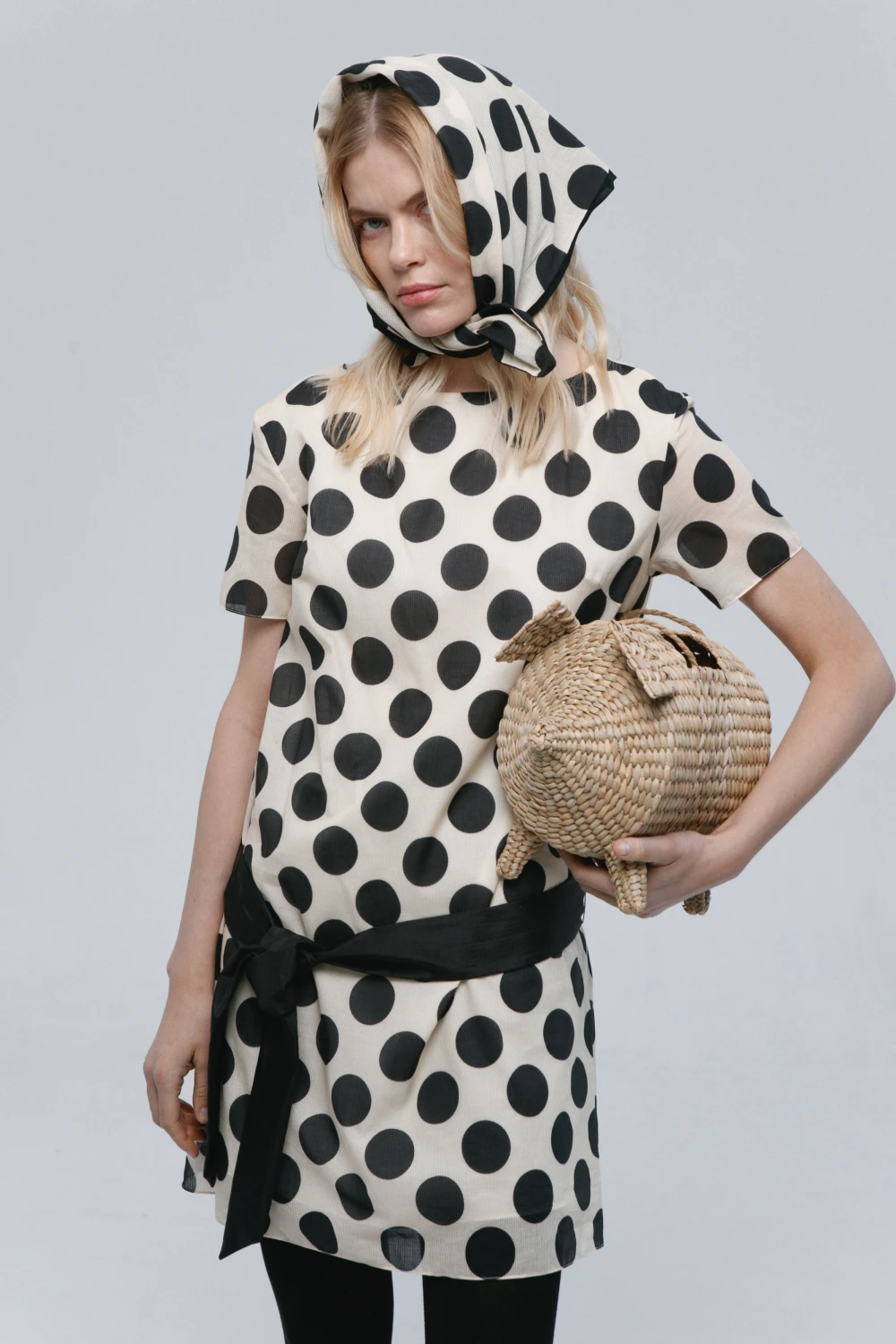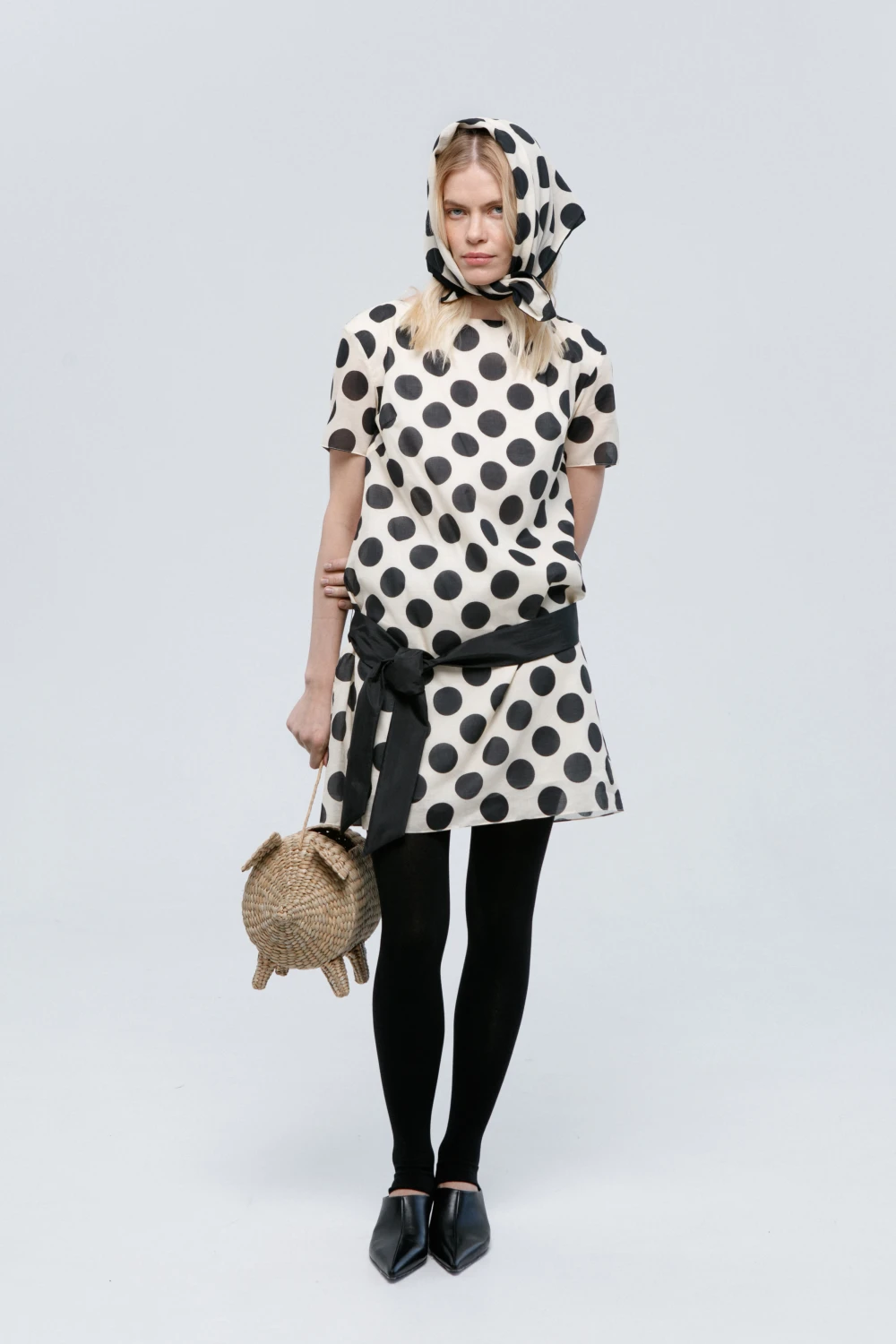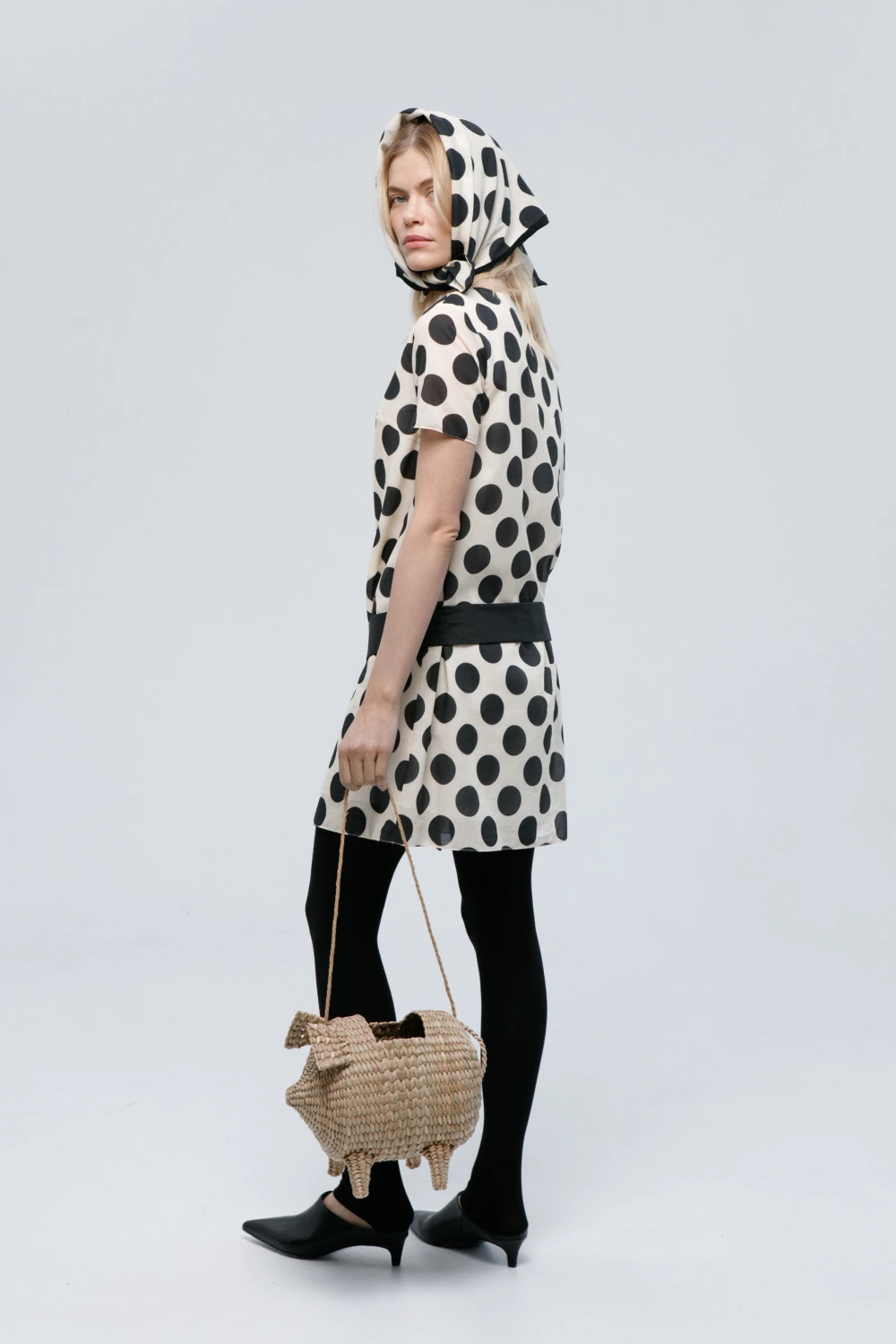Платье мини прямого кроя с коротким рукавом. В комплекте идет пояс.